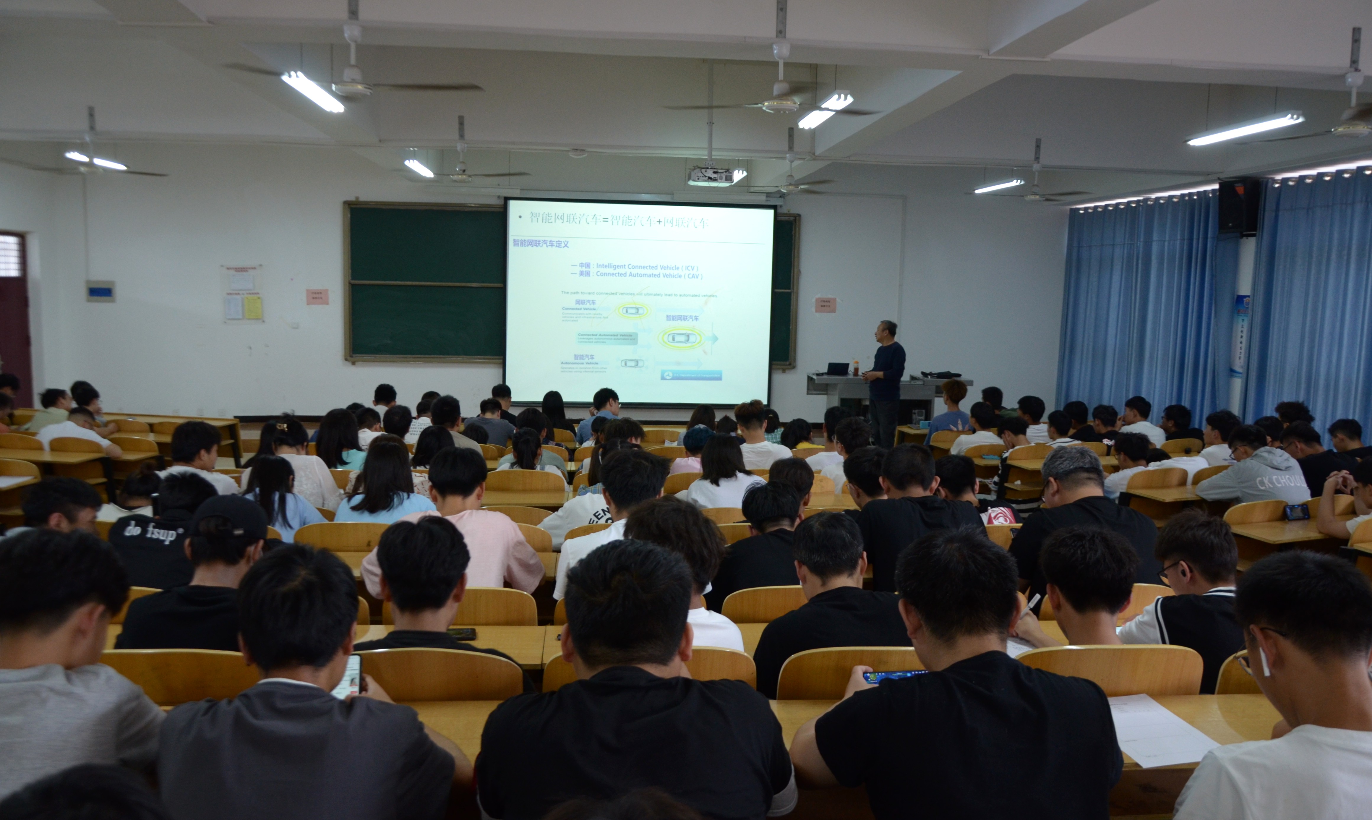 最后,张永学教授简要阐述了新时代的智能网联汽车行业的人才需求。从从业人员数量问题进行分析,再到车辆工程专业的相关课程方面提出建议,并做出大胆假设——未来智能网联汽车发展可能会出现较大人才缺口,并鼓励同学们努力提升自己的能力,抓住这个机遇,为自己的人生添光添彩。