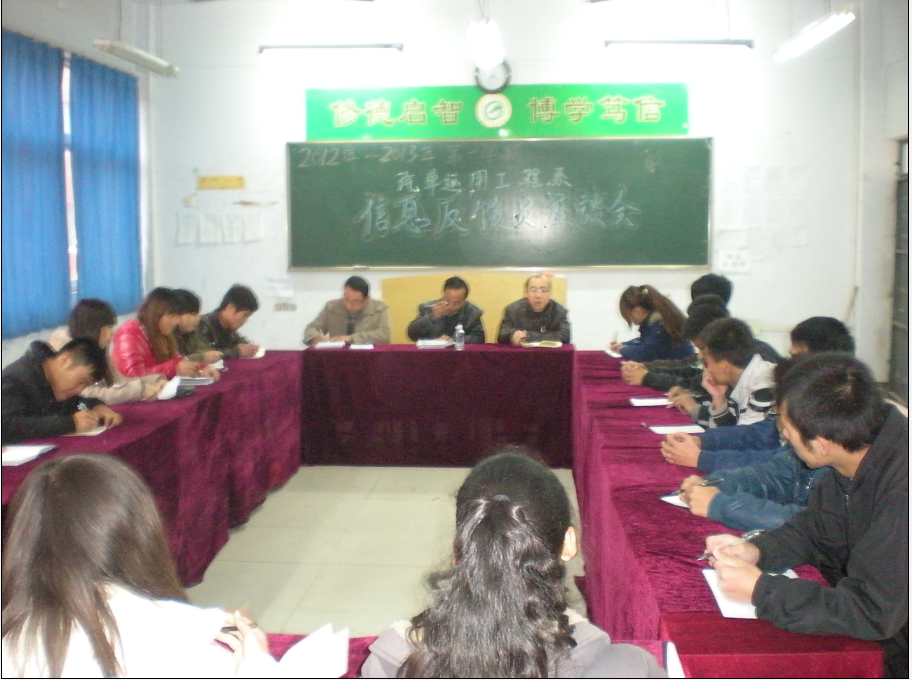 汽车运用工程系于2012年11月15日下午在综合教学楼410教室召开了2012—2013年度第一学期员工座谈会,此次座谈会的主题是“信息反馈工作中存在的问题及对策”。院教育质量督查办公室张洪顺老师、汽车运用工程系主任张永学、教学干事和柯老师,以及十多名员工代表参加座谈会。
